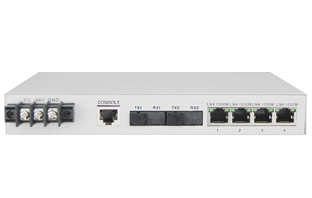 The device provides 4Channel 10M/100M /1000M Ethernet interface master fiber interface and backup interface. This four Ethernet interface is switch interface can be cascaded through 2 fiber interface convenient for chain group network support VLAN.