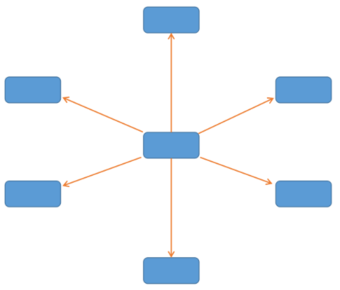 星型拓?fù)浣Y(jié)構(gòu)中,中央?yún)R聚節(jié)點(diǎn)單元以放射狀連接到網(wǎng)中的各個結(jié)點(diǎn)。網(wǎng)絡(luò)中的各節(jié)點(diǎn)通過點(diǎn)到點(diǎn)的方式連接到一個匯聚節(jié)點(diǎn)(多光匯聚型交換機(jī))上,由該匯聚節(jié)點(diǎn)向每個目的節(jié)點(diǎn)傳送信息。星型拓?fù)浣Y(jié)構(gòu)圖如下: