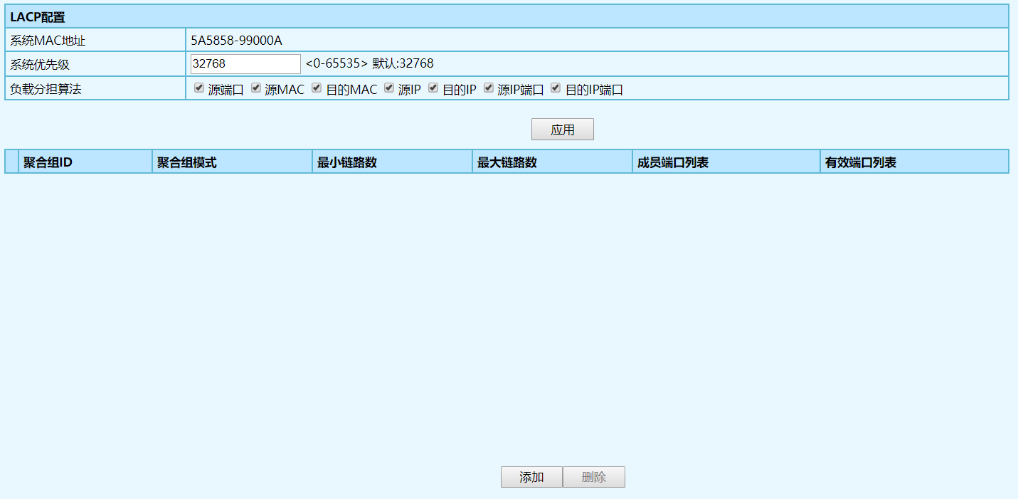 | 優(yōu)先級(jí) | 端口的鏈路聚合優(yōu)先級(jí),范圍為<0-65535>,默認(rèn)值為 32768。優(yōu)先級(jí)值越小則越優(yōu)。 |