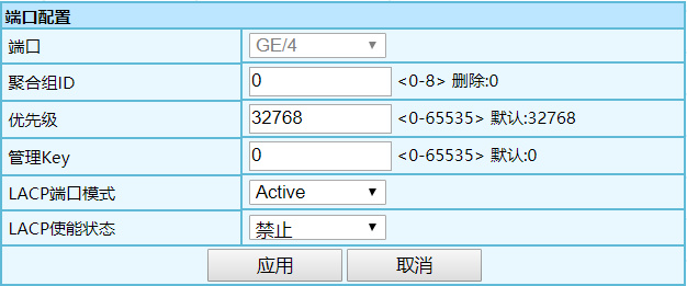 端口的 LACP 使能狀態(tài): 使能:開啟端口的 LACP。 禁止:關(guān)閉端口的 LACP。注:端口默認(rèn)為禁止?fàn)顟B(tài)。 |