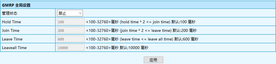 3.如需修改 GMRP 的全局配置,在 GMRP 全局配置框中修改相應配置,然后單擊<應用>。