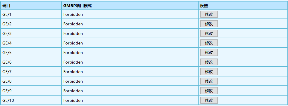 2.在[GMRP 端口設置]界面中可以查看 GMRP 的端口配置,如下圖所示。