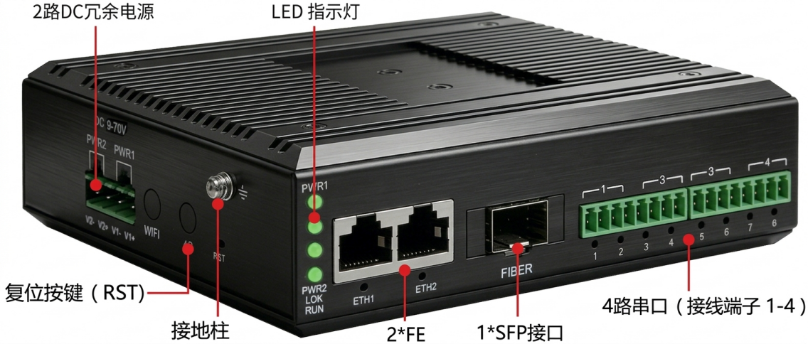 • 4*RS232/422/485軟件可配 • 300bps~921600bps • 2*FE可級連設備 • 1*SFP光口遠傳網(wǎng)絡 |
