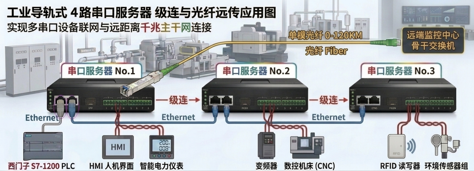 應用場景一:2電1光串口服務器: 3臺設備電口級連,光口遠傳