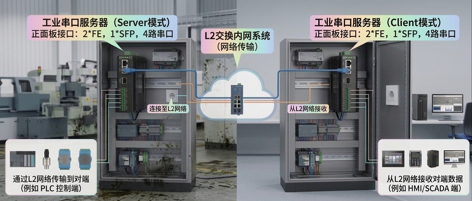 應用場景二:兩臺成對應用,中間通過網(wǎng)絡交換層傳輸1-4路串口