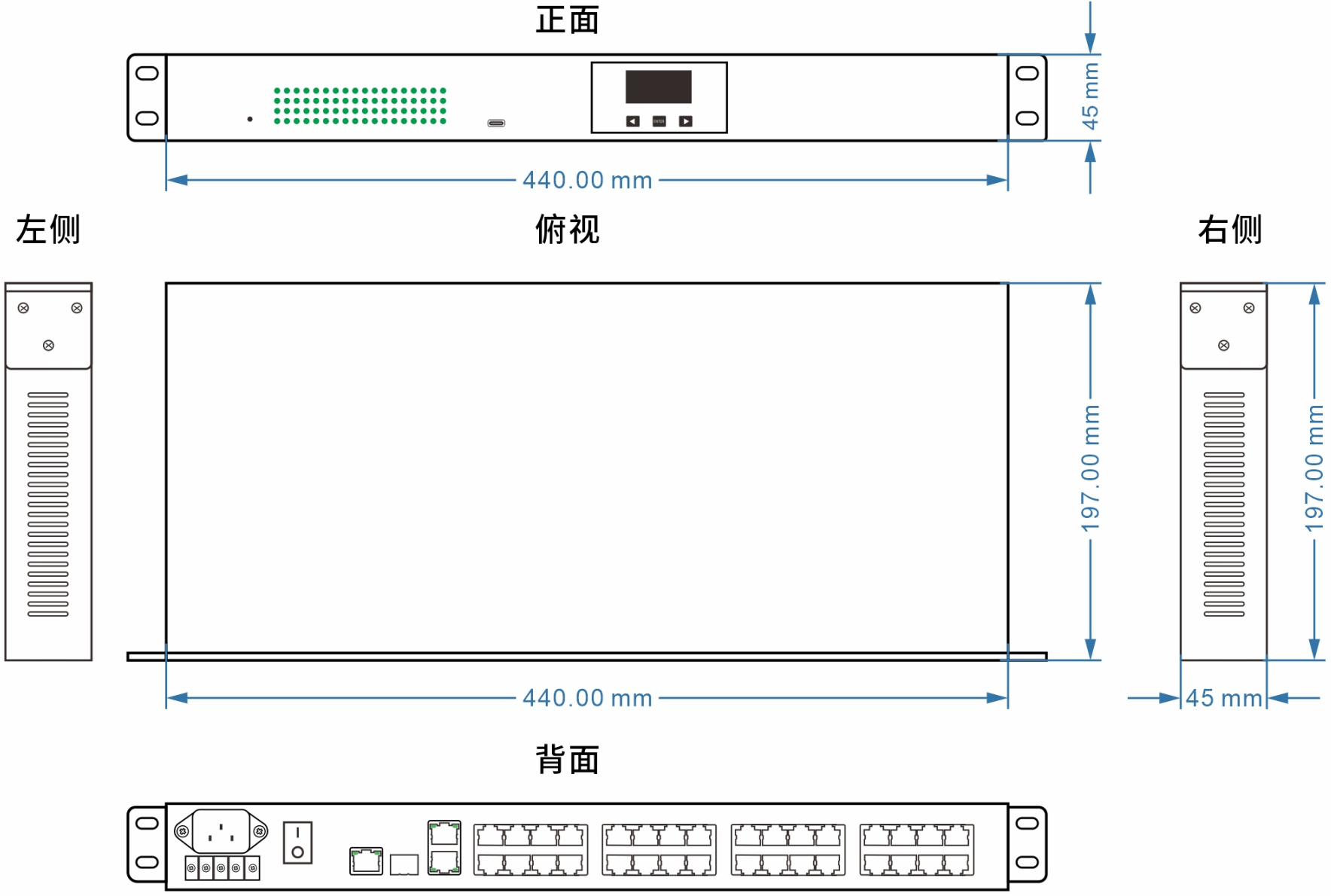 | 業(yè)務端口描述 | 32個RS232/422/485串行接口;2路千兆以太網(wǎng)電口,1路百/千兆以太網(wǎng)光口,一個Console接口,一個USB C口 |