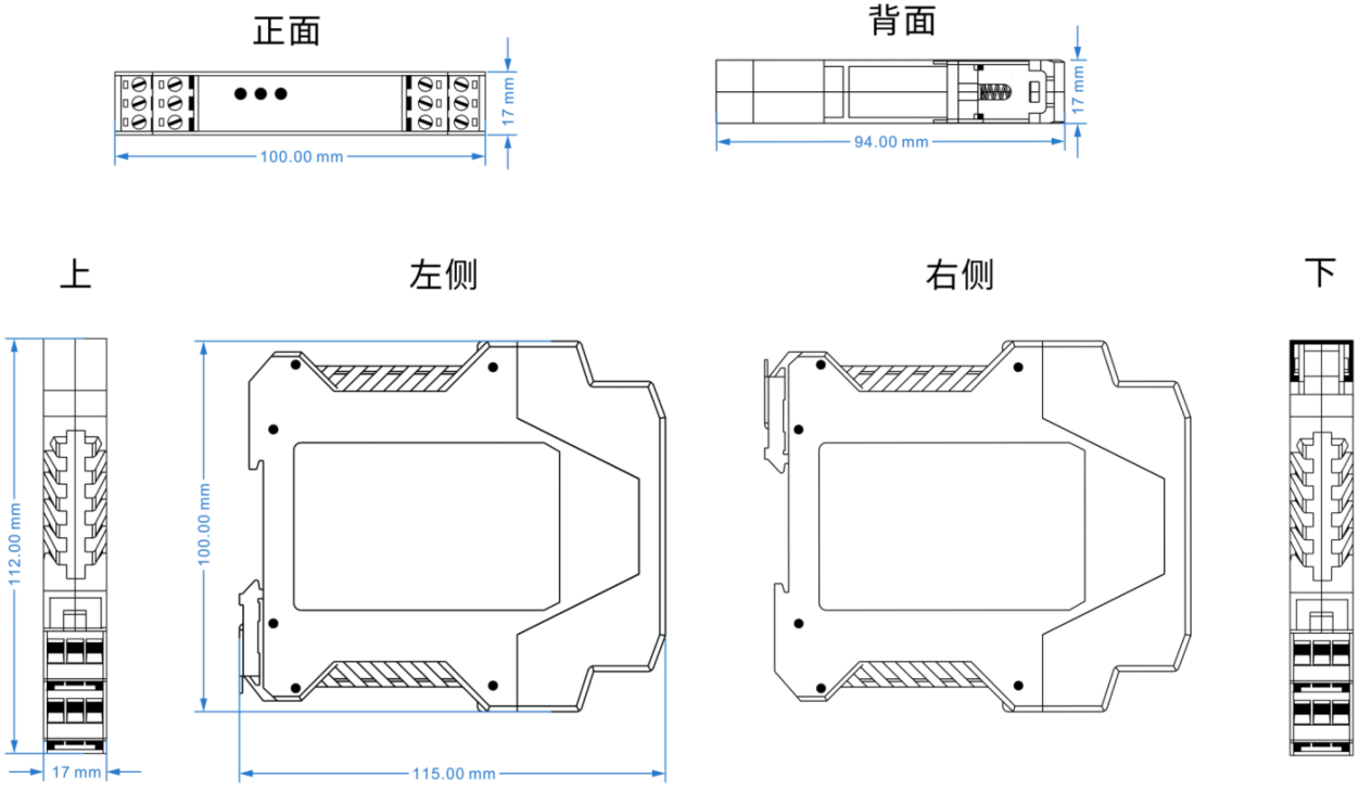 電源輸入DC9-70V ,功耗<1W 過載保護:支持;反接保護:支持; 接入端子:3芯5.08mm間距端子 |