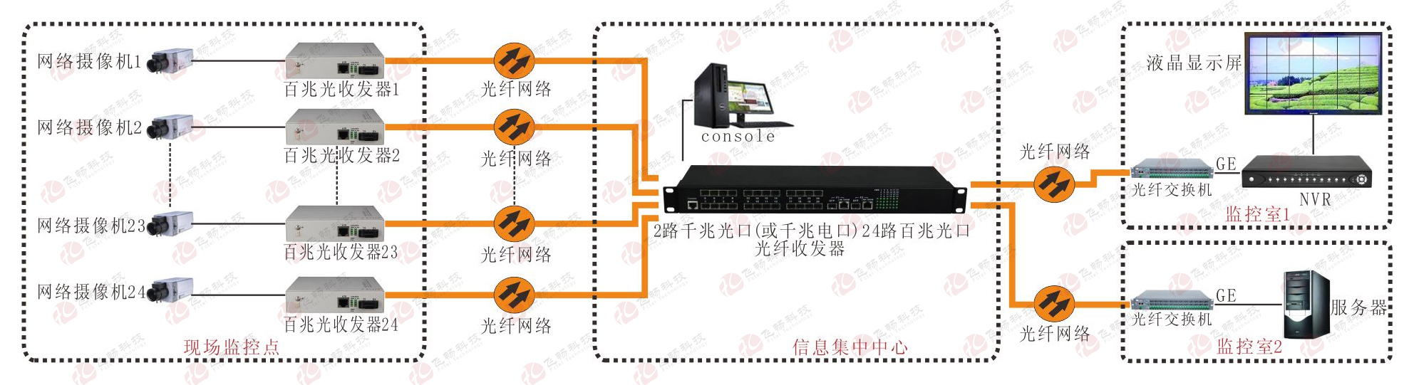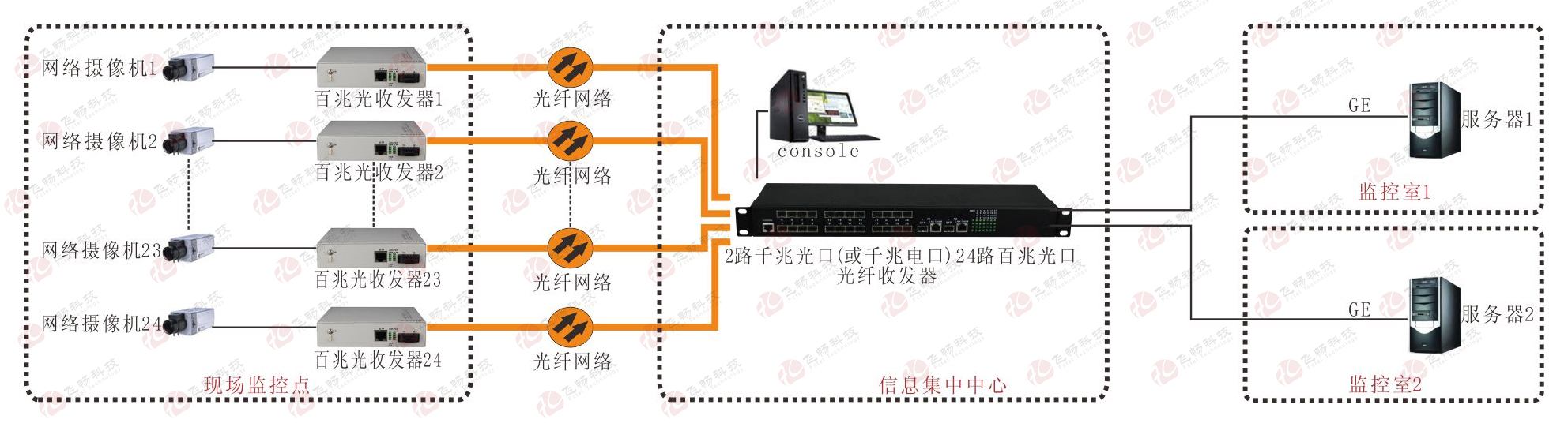 24+2光纖匯聚型交換機(jī)是一種用來將遠(yuǎn)端的24個光方向百兆光信號集中交換的光電信號交換機(jī)。