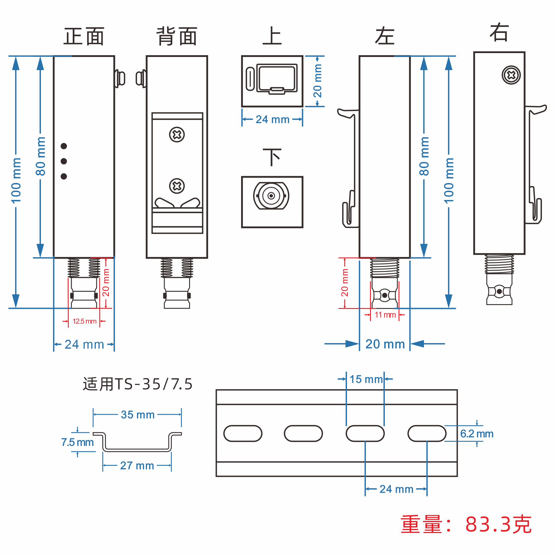 外殼:IP40防護(hù)等級 尺寸:100mm(長) x 24mm(寬) x 20mm(高) 安裝方式:導(dǎo)軌安裝、壁掛式安裝 |