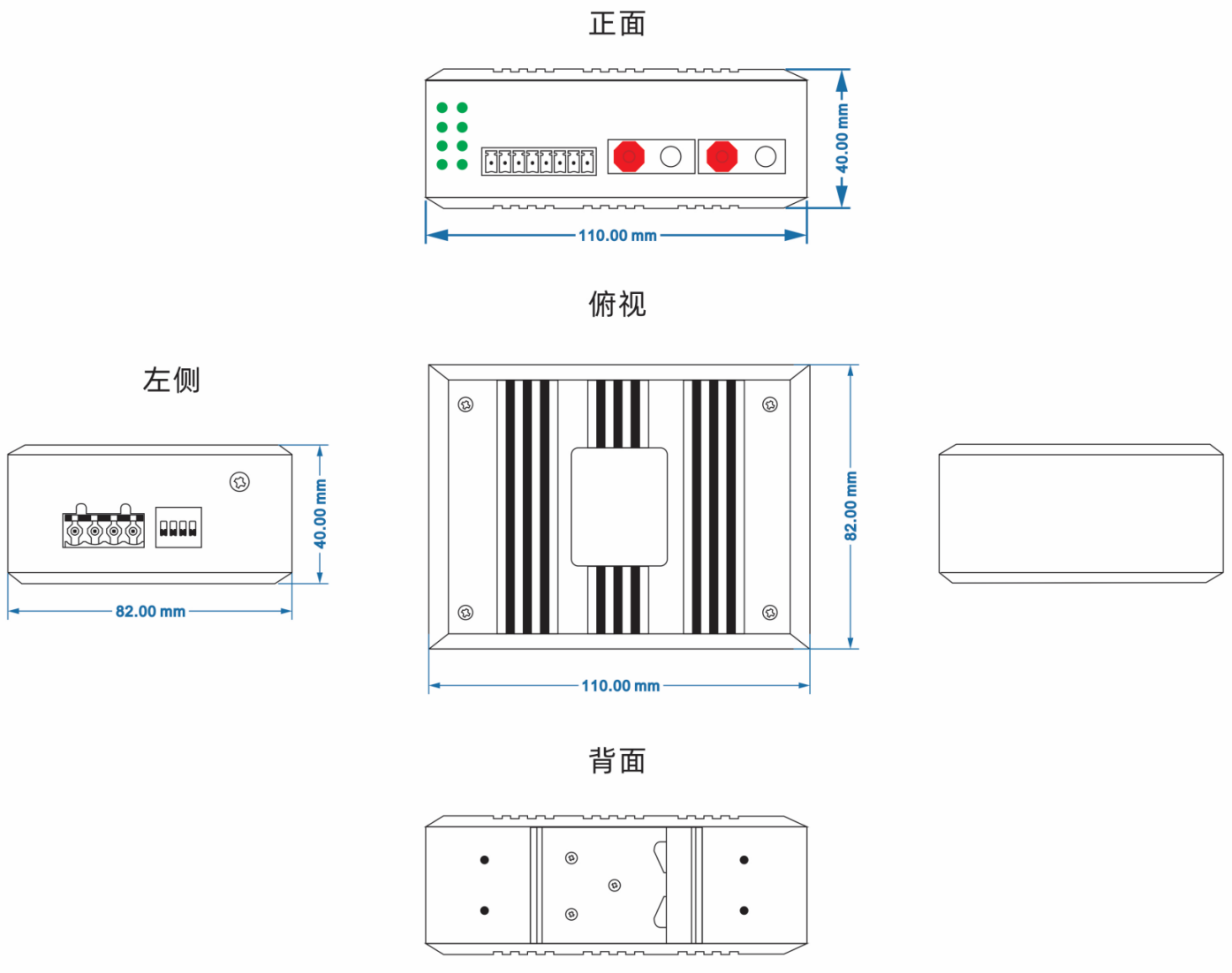 (110mm(長) x 86mm(寬) x 40.5mm(高) 安裝方式:導(dǎo)軌安裝、壁掛式安裝 |
