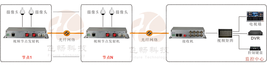 本產(chǎn)品均由光節(jié)點機和光接收機組成,節(jié)點機最多可同時傳輸2路正向視頻和1路RS485數(shù)據(jù),接收機最多可接收8路視頻和1路RS485數(shù)據(jù),一芯光纖鏈路最多可串接8個節(jié)點。